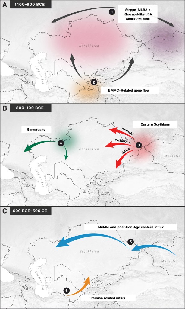 Steppe 2 – ( ~65% Corded ware + ~20% BMAC + 15% Khovsgol (Closest – Tuvanian) ). This type of admixture became more common in the Steppe populations after 900 bc and lead to formation of groups such as Scythians and Huns. Groups such as Jats and Rors, seem to have additional Steppe ancestry and claim descent from groups such as Massagetae. (https://advances.sciencemag.org/content/7/13/eabe4414).
